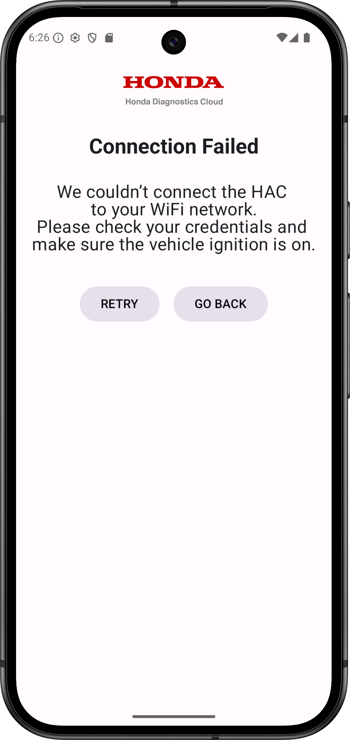 And if the connection fails, the app displays a 'Connection Failed' page with options to ‘RETRY’ and ‘GO BACK’ buttons.