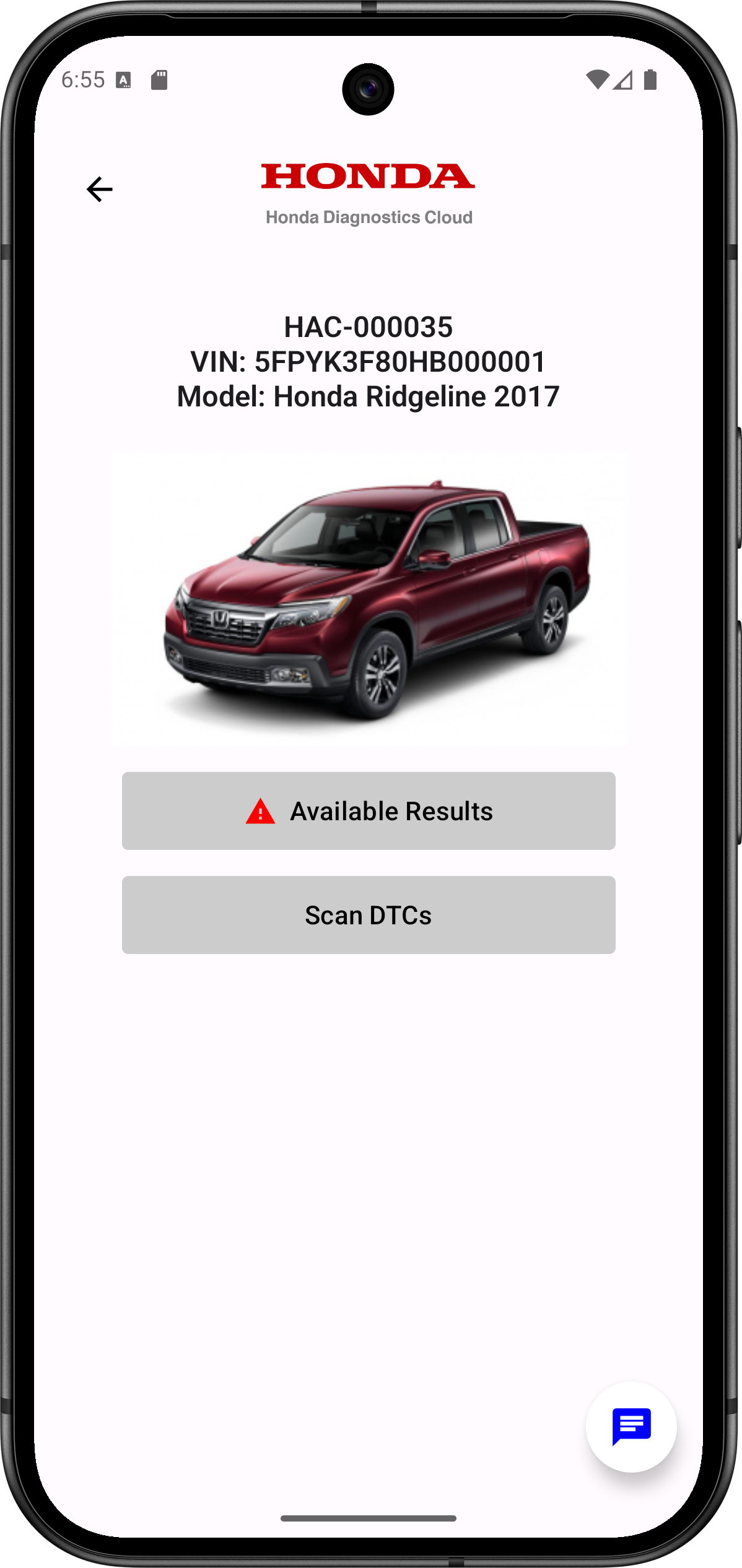 - Once you are directed to the Vehicle Info page, you will see the HAC serial number, VIN, make, model, year, car image, as well as the "Available Results" and "Scan DTCs" buttons.