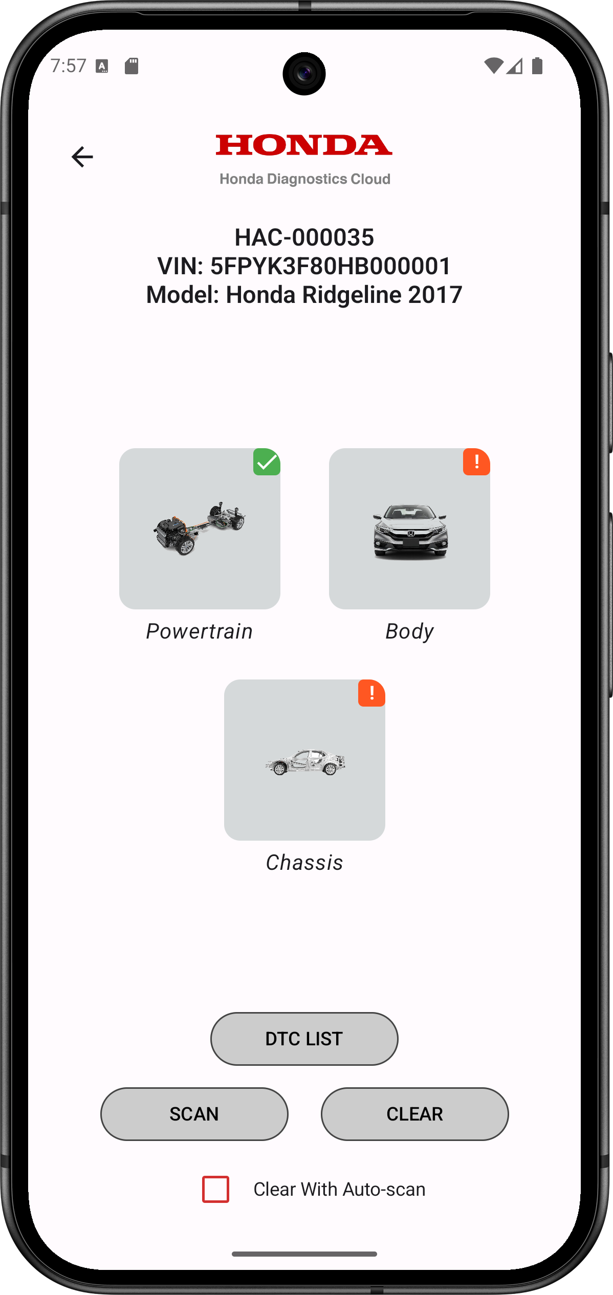 - Tapping on the ‘Powertrain’ Icon will display active DTCs that are present.
