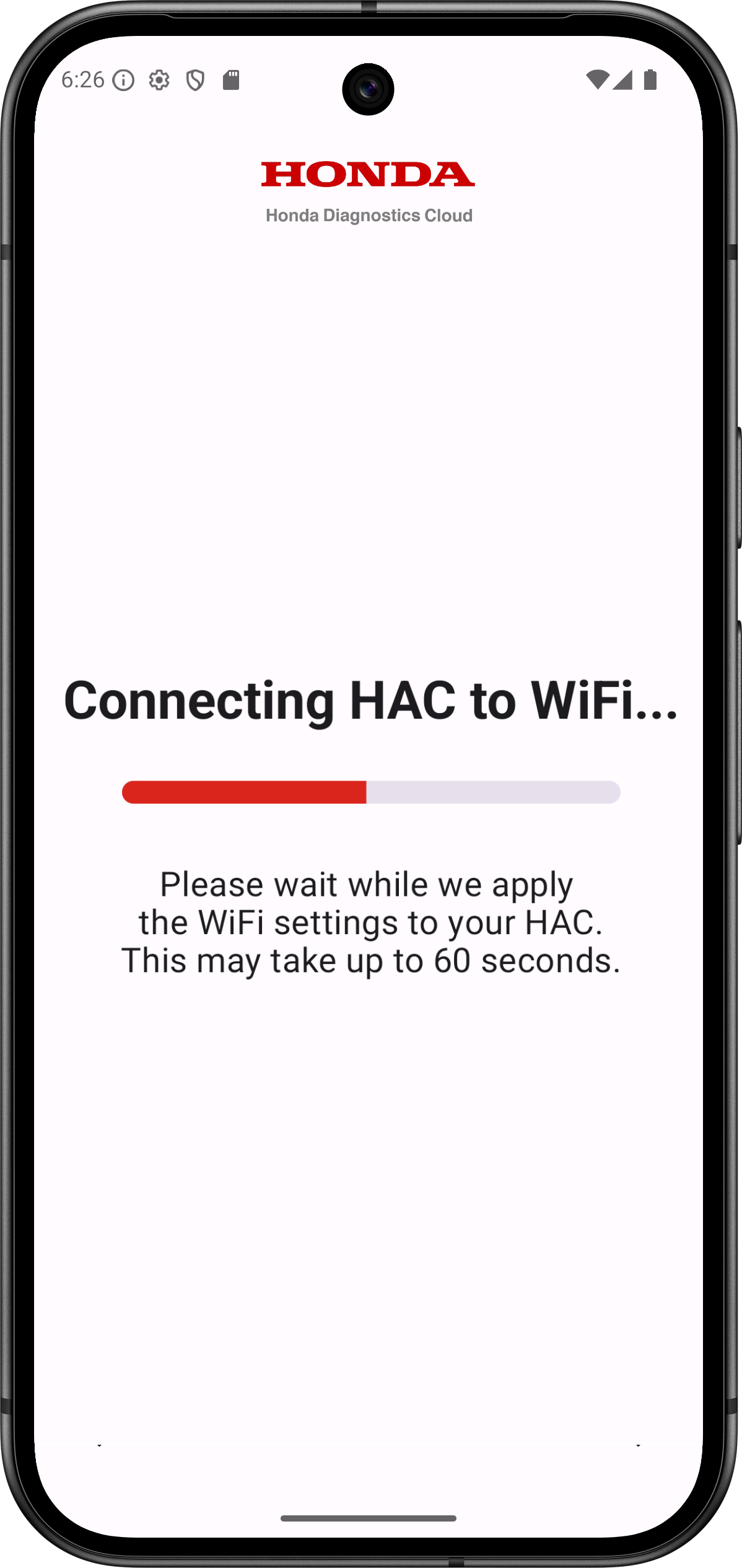 The HAC will now attempt to connect to the provided Wi-Fi SSID name. You will be redirected to the 'Connecting HAC to Wi-Fi...' screen. Generally, this process may take up to 60 seconds to complete the process.