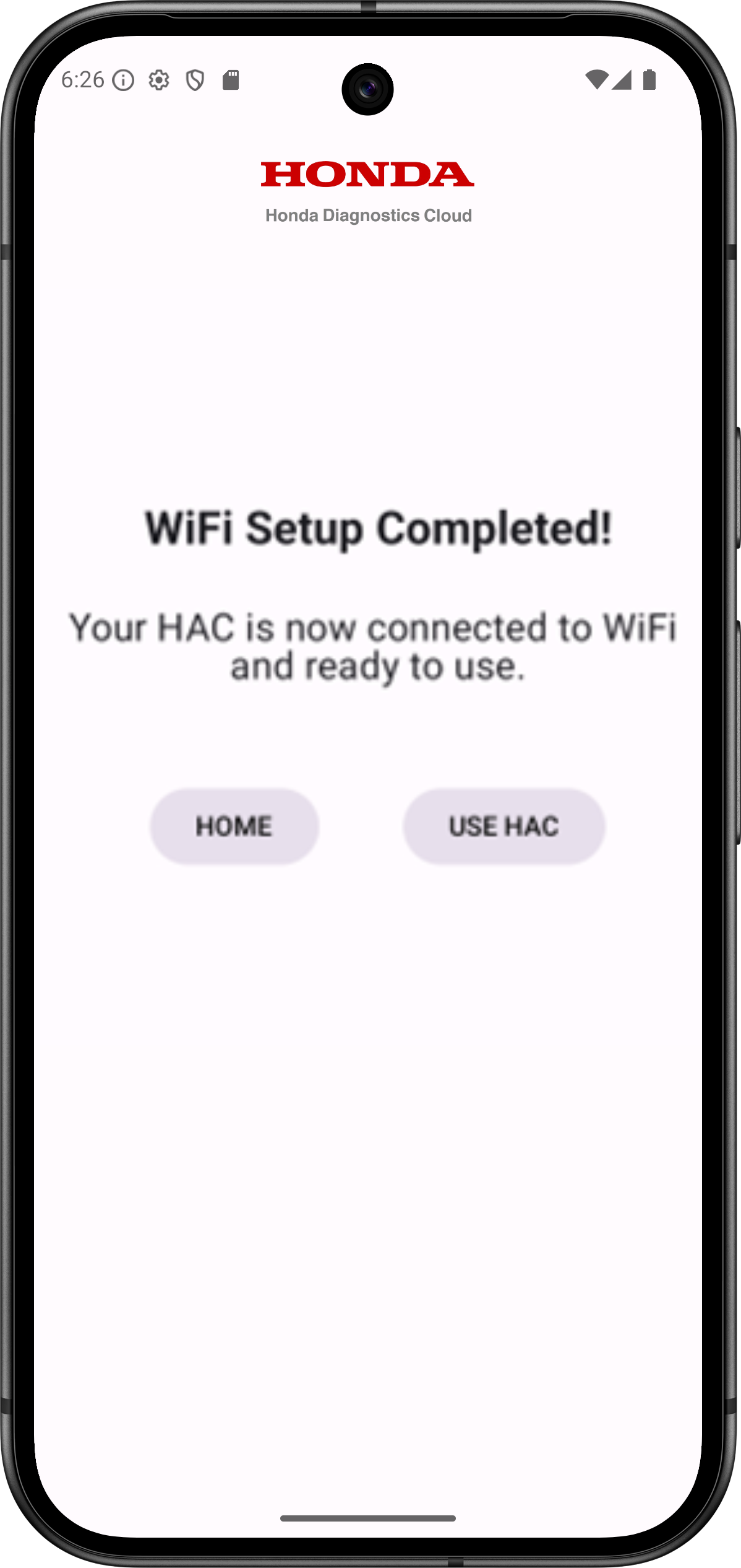 If HAC connects to the Wi-Fi successfully, you'll see the 'Wi‑Fi Setup Completed! with ‘HOME’ and ‘USE HAC’ options.